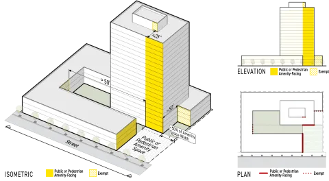 Upper Story Facade: Pursuant to Sec. 14.2.10.E. (Upper Story Facade), upper story facade is defined as the portions of the exterior building envelope at the perimeter of each upper story for the full height of the story.